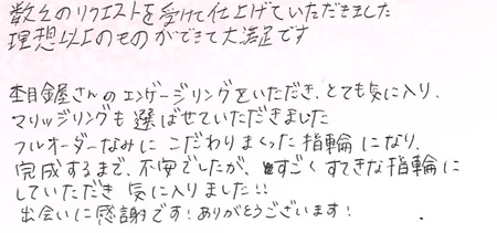 唯一無二のリングになることが決め手で木目金屋さんにお願いしました。