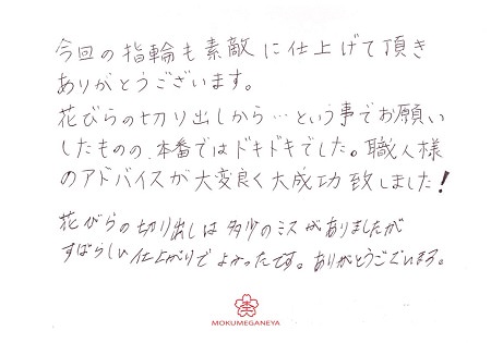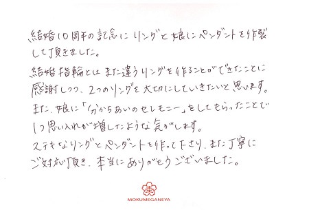 結婚10周年に、とても素敵なリングを作っていただき、ありがとうございます。
