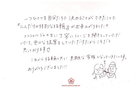 想像を上回る美しさ、可愛さのリングにしあがっていて感動しました!三重県 T.Y様 Y.I様(お渡し担当:浦野)