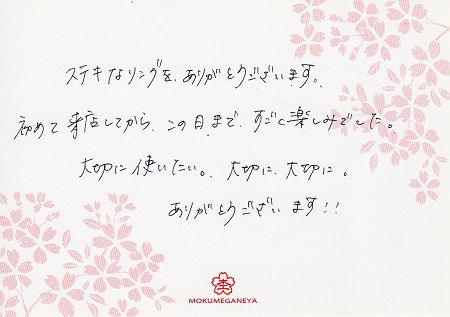 完成した指輪を見せていただいた瞬間は、光り輝く指輪にとても嬉しくなりました。
