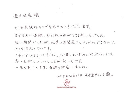 入籍後、つけるのがたのしみです。 愛知県Y.Y様 T.A様(お渡し担当:楠)