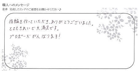 心を込めて作ってくださったリング、大切にします。 東京都 N.T様(お渡し担当:中島)