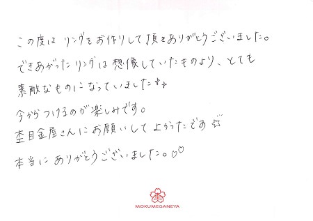 素敵なマリッジリングとエンゲージリングを作成いただき、ありがとうございました。