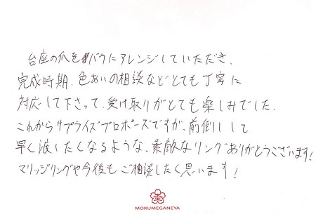 指輪を受け取った際に、キレイで私の理想とする、指輪に仕上がっていました。神奈川県M.I様(お渡し担当:保谷)
