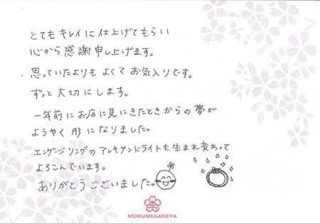 杢目金屋さんのスタッフ様、職人様 2人でデザインした世界に1つだけの指輪を今目の前にして、 とても感動しています。 一生大切にしたいと思います。 ありがとうございました。