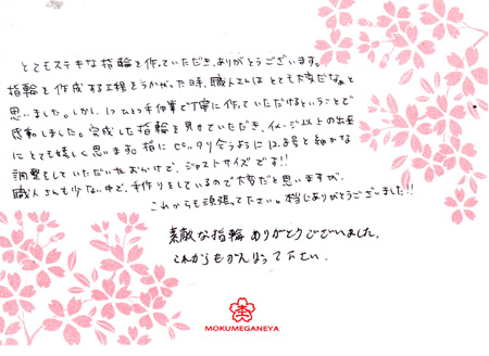 すてきなリングに仕上げていただきありがとうございました。東京都 M.T様 (お渡し担当:徳永)