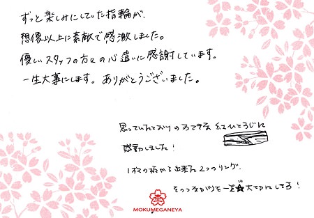 肌なじみの良く、きれいな木目のリング、ありがとうございました! 宮城県 髙橋様(お渡し担当:千葉)