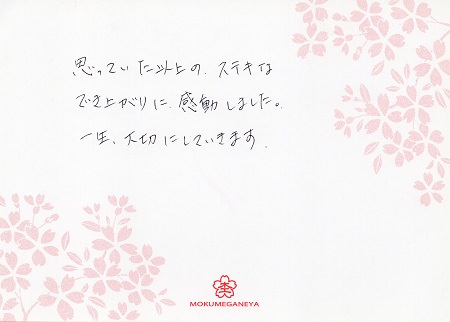 婚約指輪からいろいろワガママなことを言ってしまいデザインを決めるのに長い時間がかかってしまいましたが、それが今となっては幸せな充実した時間でした。