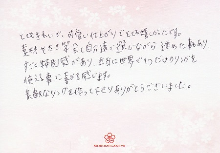 二人だけのものというのがとても嬉しく、大変満足しております。T.K様 M.K様(お渡し担当:井上)