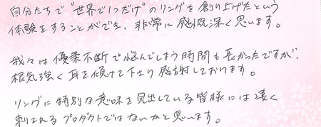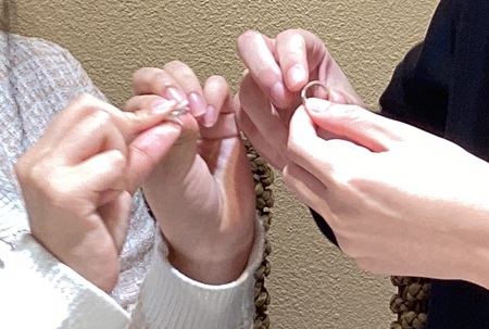 オーダーメイドで世界に一つだけの指輪が作れることに感動し、その日のうちに購入を決めました。東京都 R.N様 K.S様(お渡し担当:宮﨑)