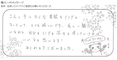 すてきな指輪をありがとうございます。 埼玉県 T.E様 Y.S様(お渡し担当:小原)