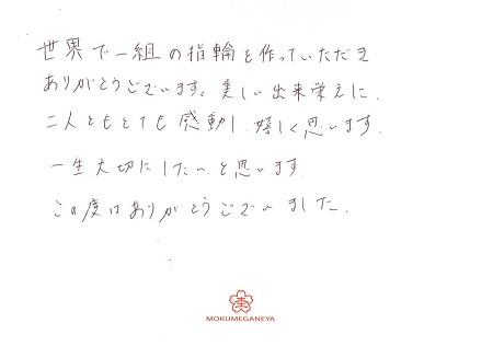 結婚指輪もとても素晴らしいものを創って頂きありがとうございます!
