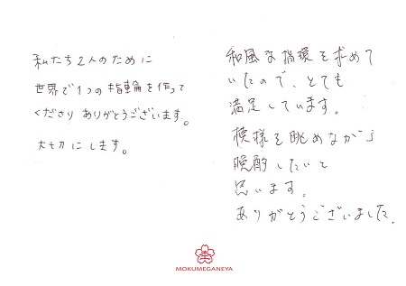 愛着の湧くリングとなりました。 東京都 S.M様 M.S様(お渡し担当:中島)