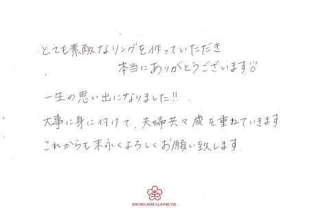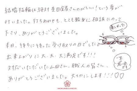 仕上がったリングを手に取って感動しました。山口県 K.K様 R.F様(お渡し担当:喜多村)