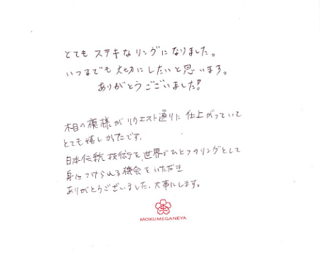 また、私たちの完成イメージ通りの指輪を作って頂き、ありがとうございます♡