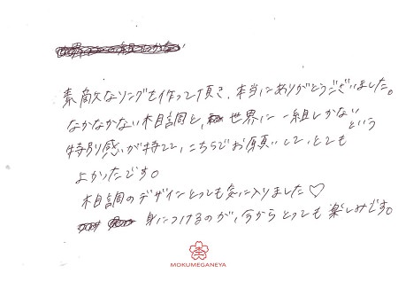 本当に素敵な指輪をありがとうございました。京都府 S.F様 E.U様(お渡し担当:土肥)