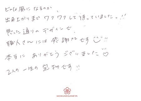 作成される職人さんへの感謝もあり、一生涯大切にこれからの人生をこの指輪と共に歩んでいきたいです。