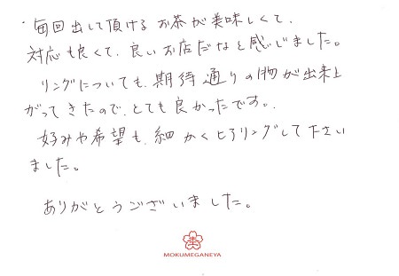 世界に1つだけのリングをペアで持つことができ、嬉しいです。兵庫県 Y.T様 T.T様(お渡し担当:深田)