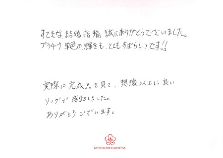 この度は素敵なリングを作って頂きありがとうございました。 大阪府 T.T様 M.T様(お渡し担当:砂川)