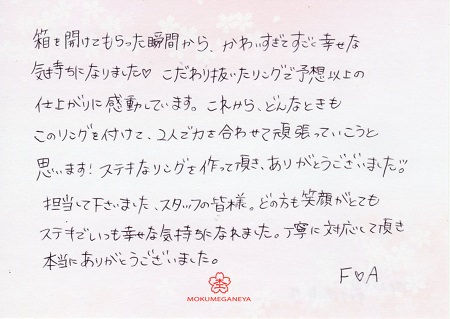 すごくキレイな指輪ができててとても嬉しいです。 和歌山県 N.I様 A.I様 (お渡し担当:下浦)