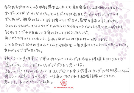 素敵な指輪をありがとうございました。 宮城県 S.K様 M.K様 (お渡し担当:布田)