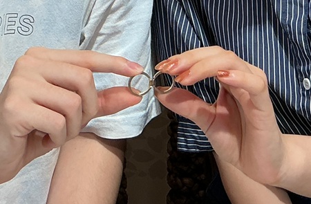 実際に完成した指輪をつけてみて、自分たちでこだわったデザインが