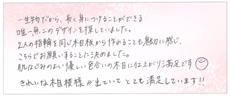 杢目金屋さんの指輪は自分達の理想をかなえてくれるものでした。大阪府Y.A様 M.A様(お渡し担当:馬谷)