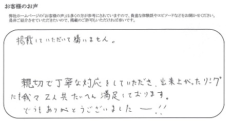 作っている工程でも決めることが多く、2人だけの想い出に残る指輪ができたかと考えています。 愛知県 S.A様 M.I様 (お渡し担当:野木)