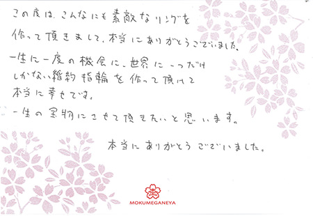 2人の想いをカタチにした世界に1つだけの記念の指輪をオーダー頂きました 東京都 S.F様 (お渡し担当:坪井)