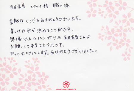 この度は素適な結婚指輪を作って頂きありがとうございました。