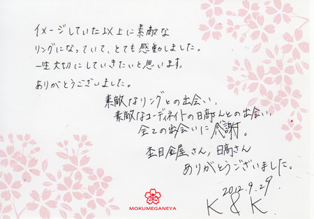 さくらダイヤモンドの婚約指輪と木目金の結婚指輪をオーダーいただきました 東京都 Y.K様 Y.Y様(お渡し担当:佐々木)