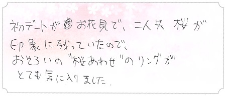 桜と木目が好きで、婚約指輪をもらった時から一目惚れでした。