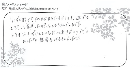 理想通りのデザインのリングが出来あがり、とても満足しています♡ 東京都 T.O様 A.W様(お渡し担当:佐藤)
