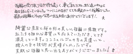 世界に1本の指輪で、特別感が味わえるので選びました。 三重県 R.O様 S.I様(お渡し担当:松井)