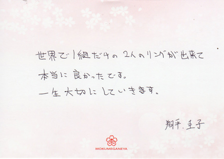 すてきな指輪ありがとうございます。 奈良県 Y.K様 E.I様(お渡し担当:濵岡)