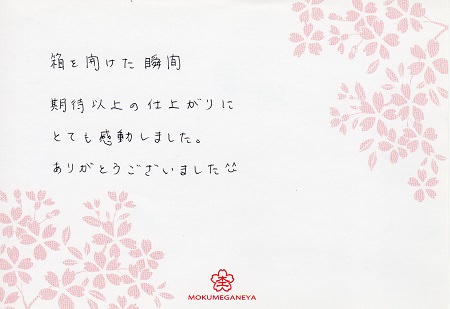 出来上がった指輪を取りに来た時、想像していたものよりすごく素敵なものに仕上がっていてとても感動しました。