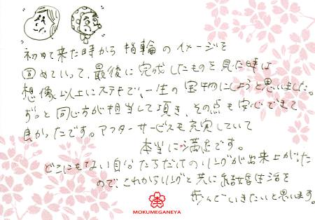 婚約指輪をオーダーいただきました 愛知県 N.K様とってもキレイでかわいい桜の指輪。想像していた以上に指に似合っていたのでびっくりしました。一生大切にします。ありがとうございました。キレイすぎて、手にするのがこわくなっちゃうくらいです。大切にしたいと思います。ありがとうございました。