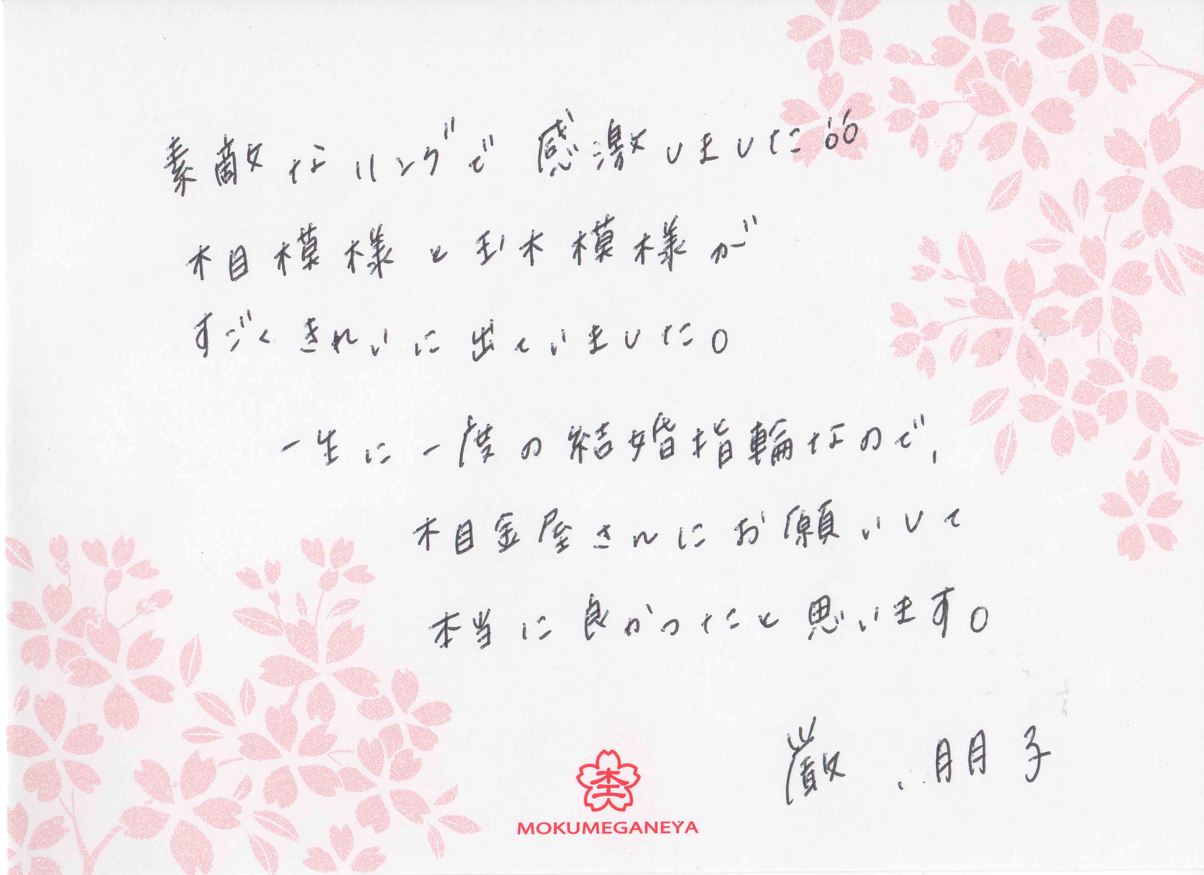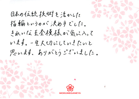 木目金の婚約指輪をオーダーいただきました 愛知県 正隆 美奈子様インパクトのあるリングで感動しました。大切にします。