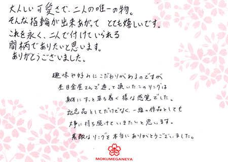 寄金細工の結婚指輪をオーダー頂きました 東京都 竹山勲様 香奈様(お渡し担当:横山)