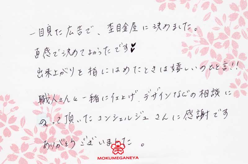 寄金細工の結婚指輪をオーダーいただきました 愛知県 堀内様 宮本様(お渡し担当:神戸)
