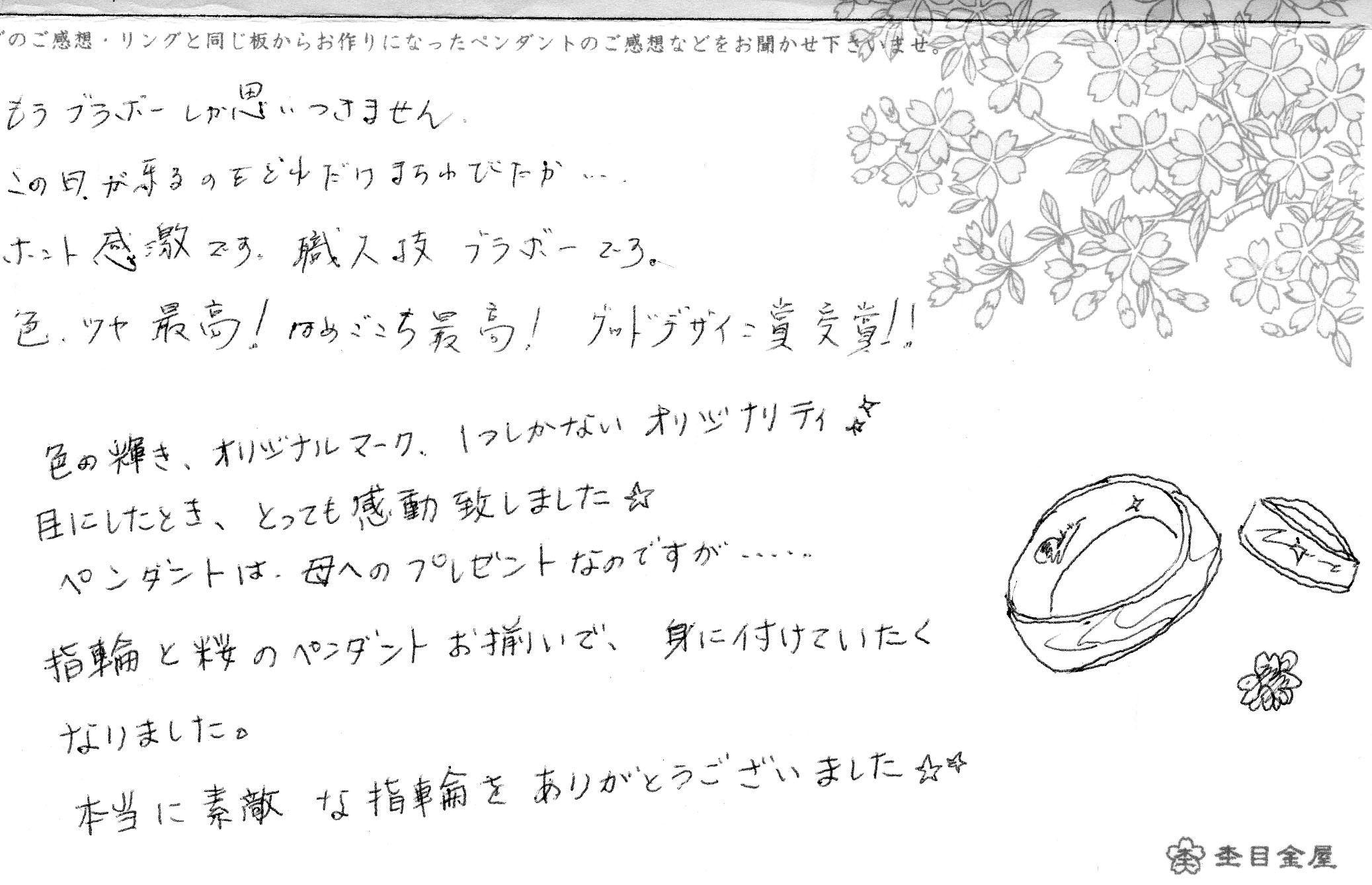 リングと同じ板から制作したペンダントです! 職人へメッセージを頂きました!!