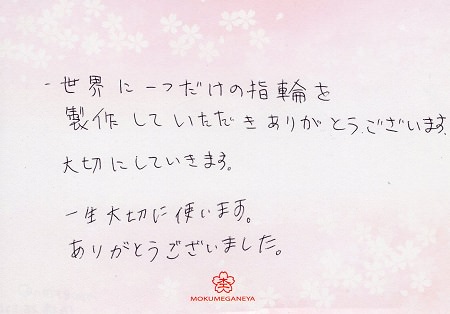 杢目金屋さんと婚約者さんに感謝です。 神奈川県 J.U様 東京都 H.H様(お渡し担当:八巻)