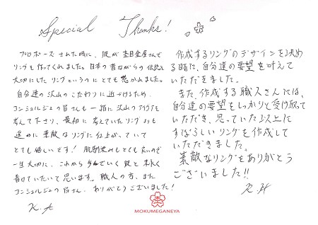本当にいい指輪をありがとうございました。大阪府M.S様 A.S様(お渡し担当:小谷)