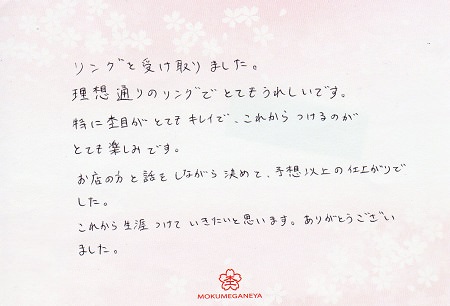 理想通りのリングでとてもうれしいです。 埼玉県 S.S様 K.K様(お渡し担当:村上)