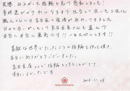 世界に1つだけの指輪、ずっと大切にしていきます。D.I様 A.I様(お渡し担当:小谷)