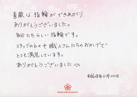 想像以上の指環が出来上がってきてとても感激しています 神奈川県 K.H様 K.Y様 (お渡し担当:飯島)