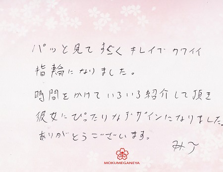 想像していた以上に素晴らしい指輪でここにお願いして良かったです。 愛媛県T・S様(お渡し担当:笹原)