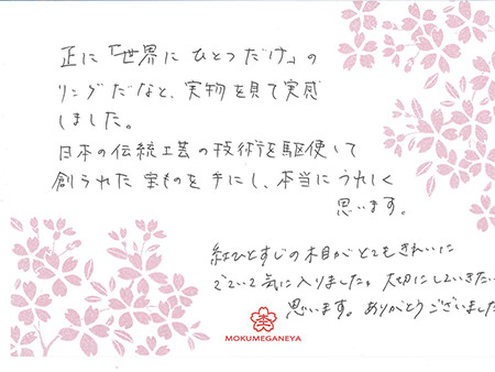 こんなに素敵な指輪を製作してくださり、本当に有難うございます。 東京都 S.N様(お渡し担当:小野)