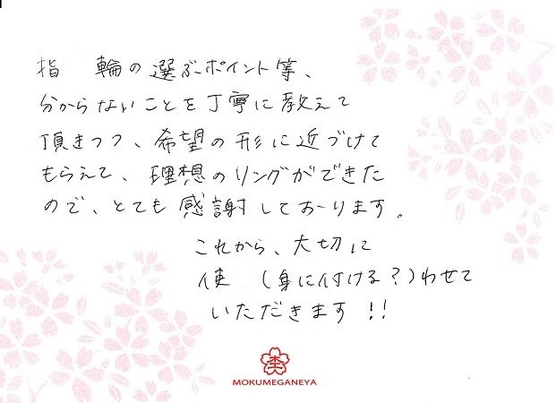 この指輪に出会えたことを感謝します。山形県 渡辺様 我妻様 (お渡し担当:白岩)