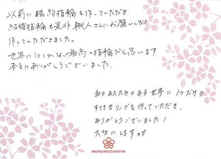 世界に1つだけの結婚指輪 神奈川県 康太様 三美子様(お渡し担当:鈴木)